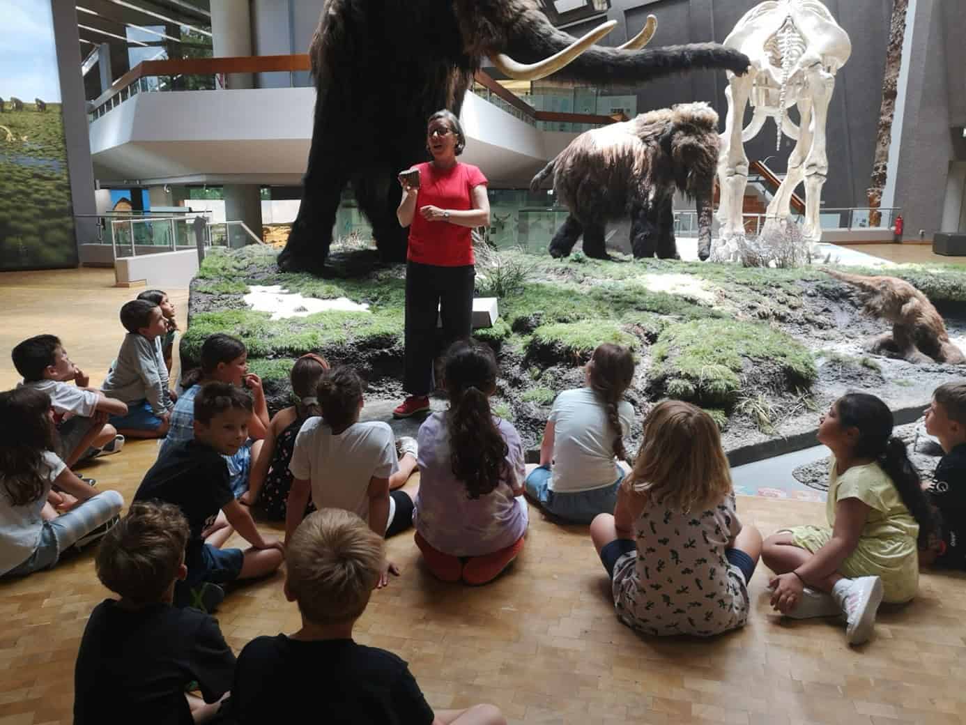 Am Mittwoch, den 12.07.23 hatten die Klassen 3a und 3b einen Ausflug ins Löwentormuseum. Wir liefen runter zur Bushaltestelle und fuhren dann mit dem Bus zur U-Bahn. Anschließend fuhren wir mit der U-Bahn zum Rosensteinpark. Im Rosensteinpark haben wir eine große Wiese gefunden und haben dort gepicknickt und Spiele gespielt. Nach einer Weile gingen wir zum Löwentormuseum. Vor dem Museum machten wir ein Klassenfoto. Endlich durften wir hineingehen. Drinnen empfing uns eine Frau, die sehr nett aussah. Das war sie dann auch. Sie begann sofort mit der Führung. Es ging um die alten Tiere, die es nicht mehr gibt, zum Beispiel: Dinosaurier und Mamuts. Die Führung ging genau eine Stunde. Am Ende kam ein Thema dran, dass ich gar nicht kannte, nämlich „Steinzeitmenschen“. Ich bin froh, dass wir nicht bei den Dinosauriern leben.
