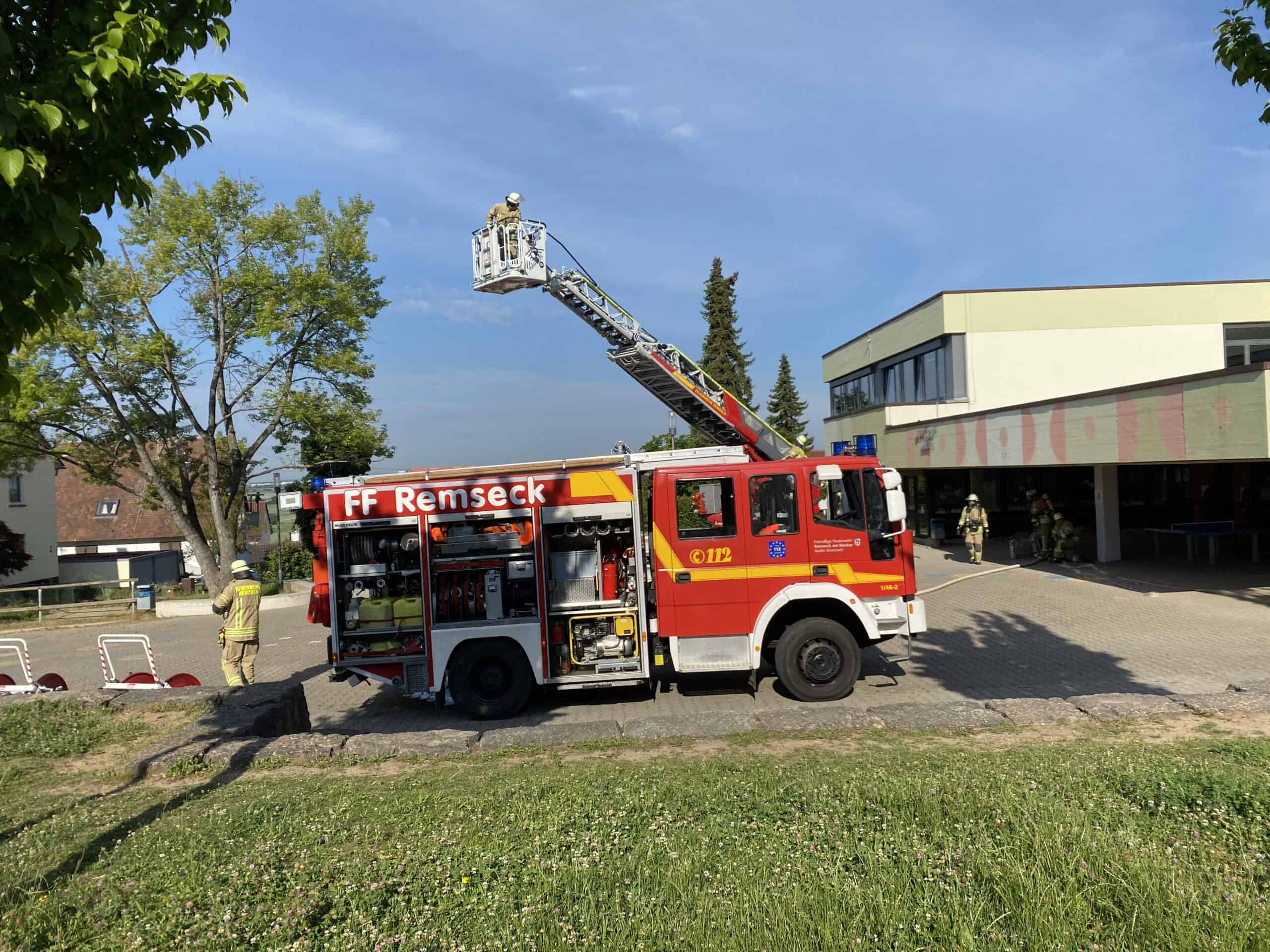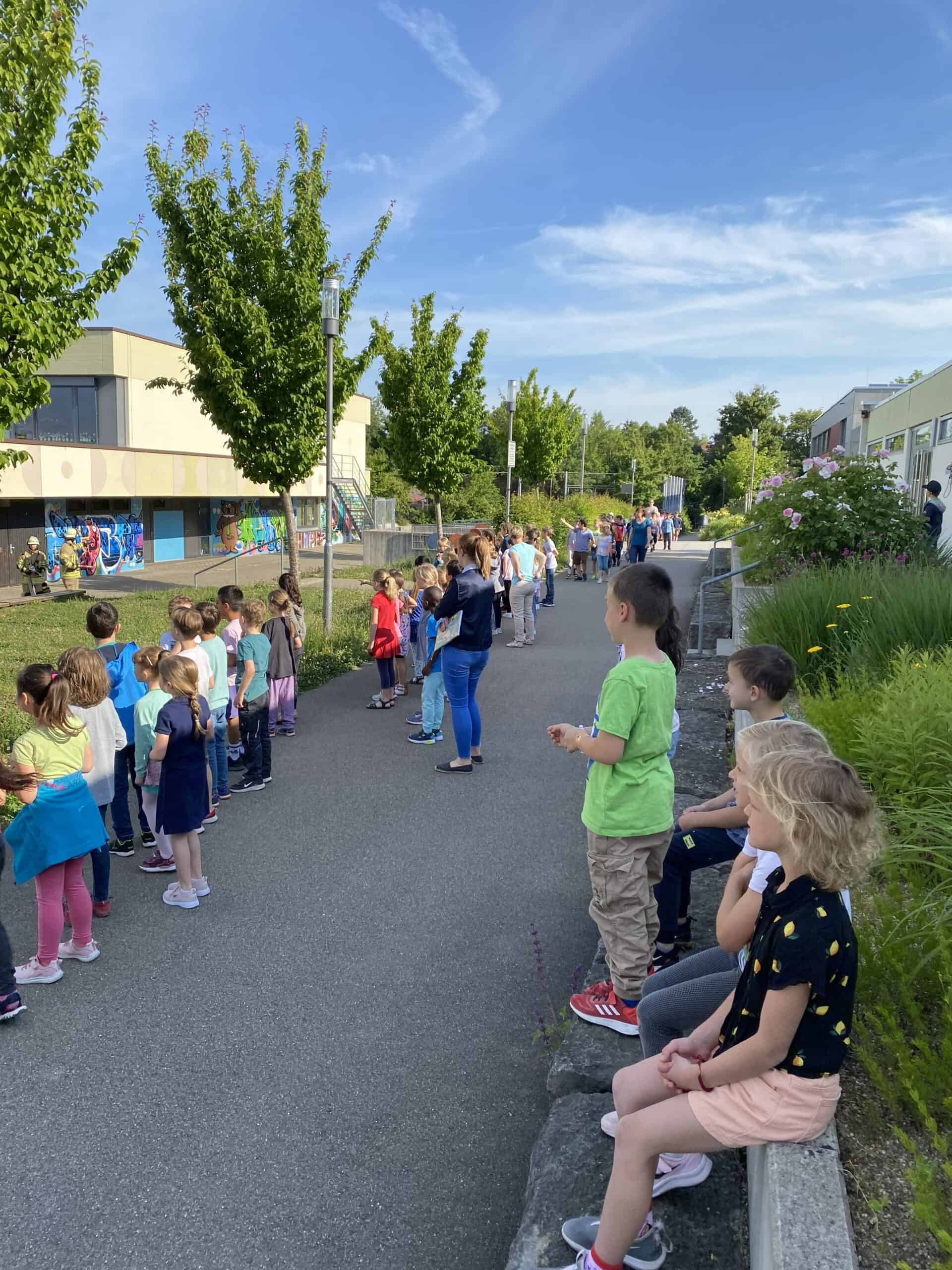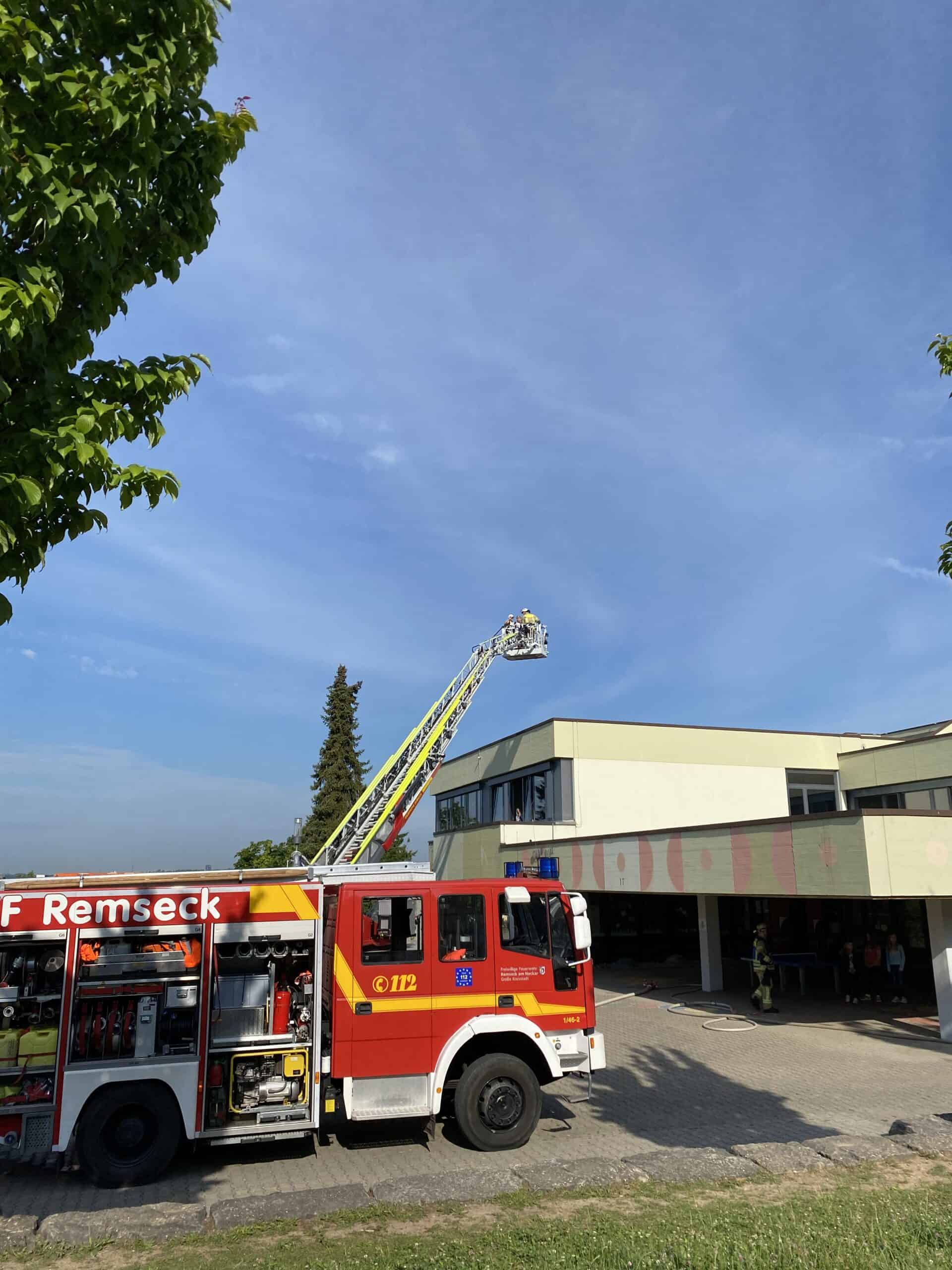 Kurz vor den Pfingstferien erklang plötzlich der Feueralarm an der Grundschule Hochberg. Routiniert verließen alle Schülerinnen und Schüler das Schulhaus, um sich auf den vorgegebenen Plätzen zu versammeln und in Sicherheit zu bringen. Die Kinderaugen waren riesig als sie auf dem Schulhof die Einsatzfahrzeuge der Freiwilligen Feuerwehr Remseck entdeckten.