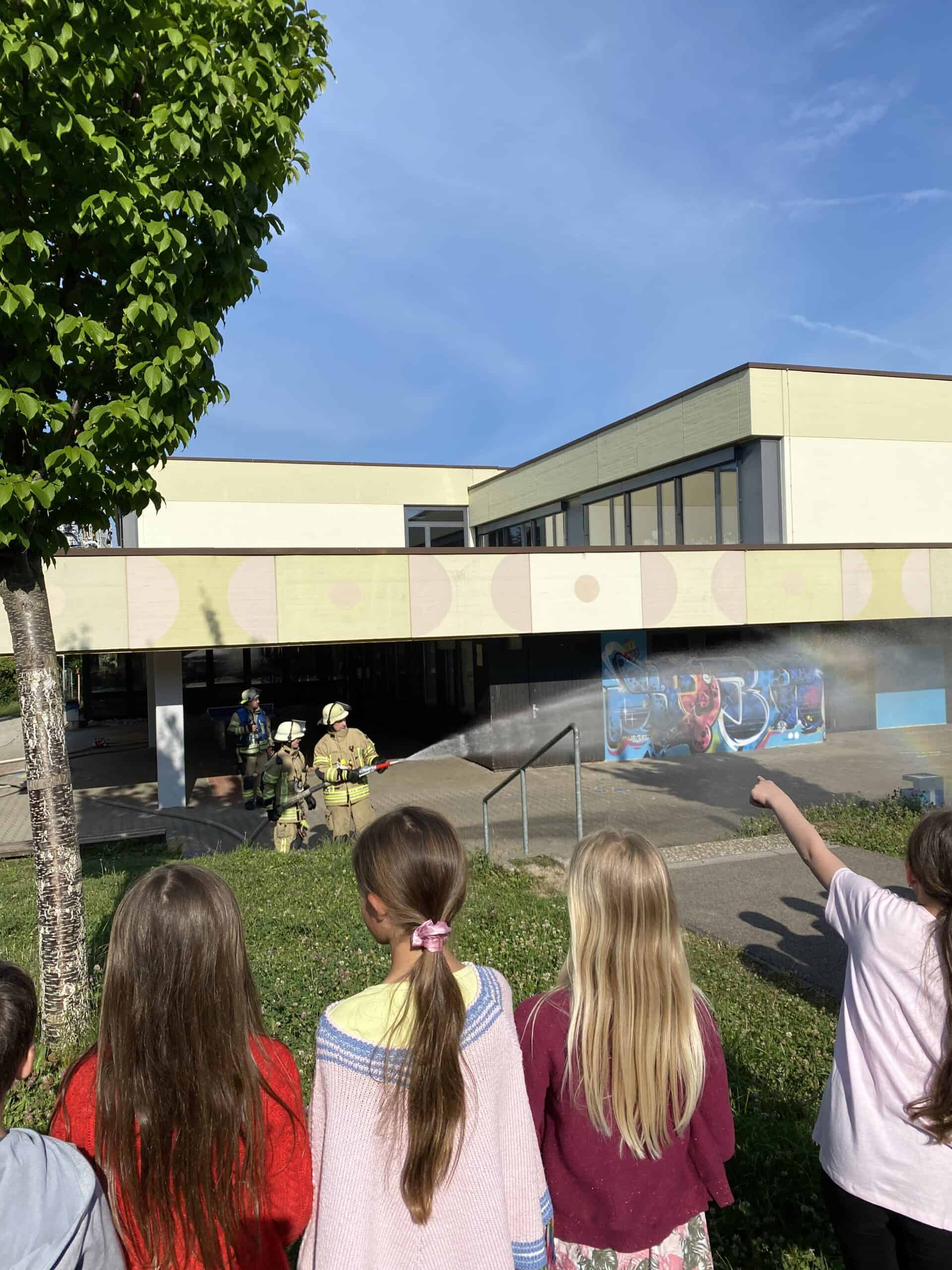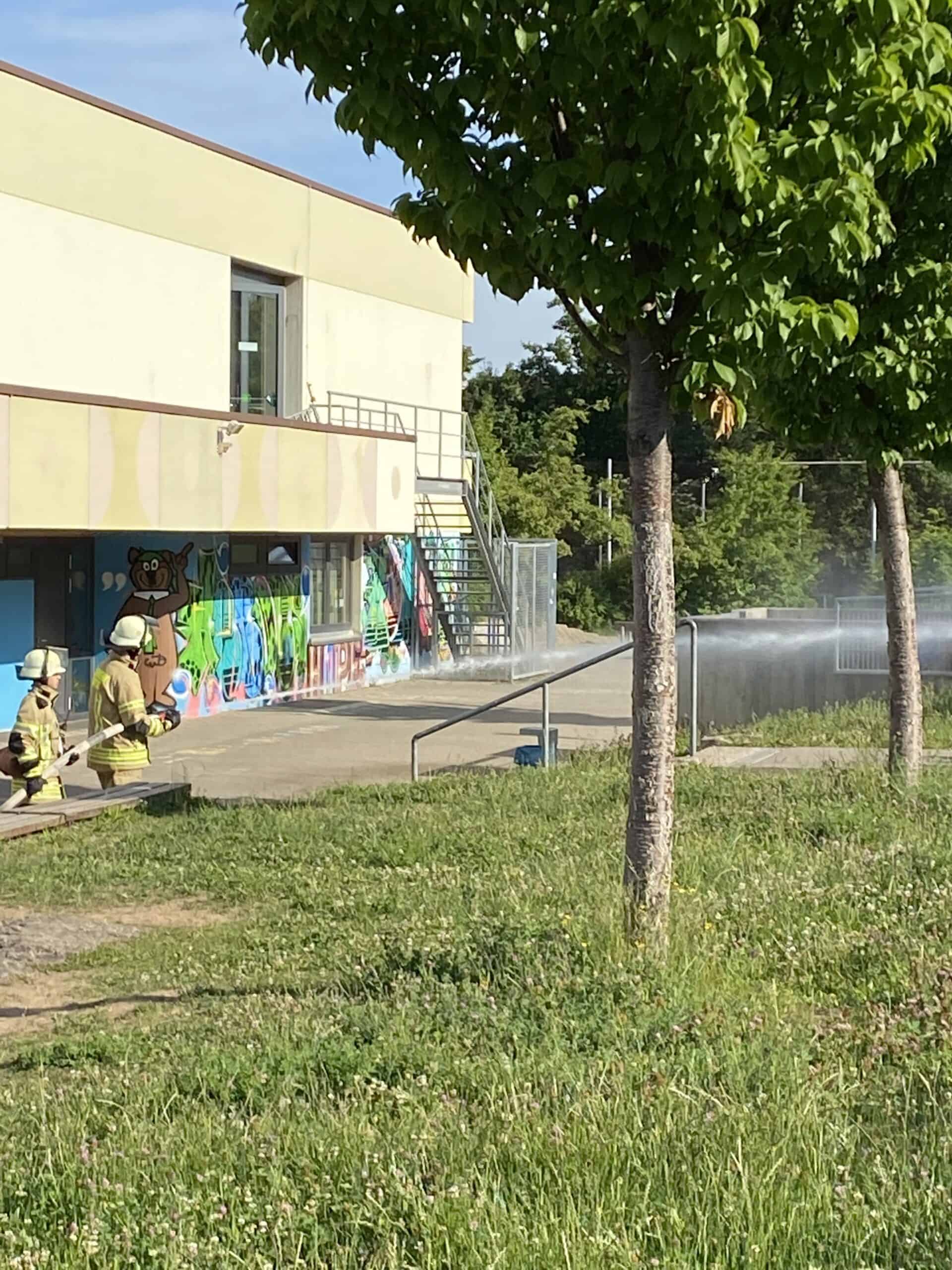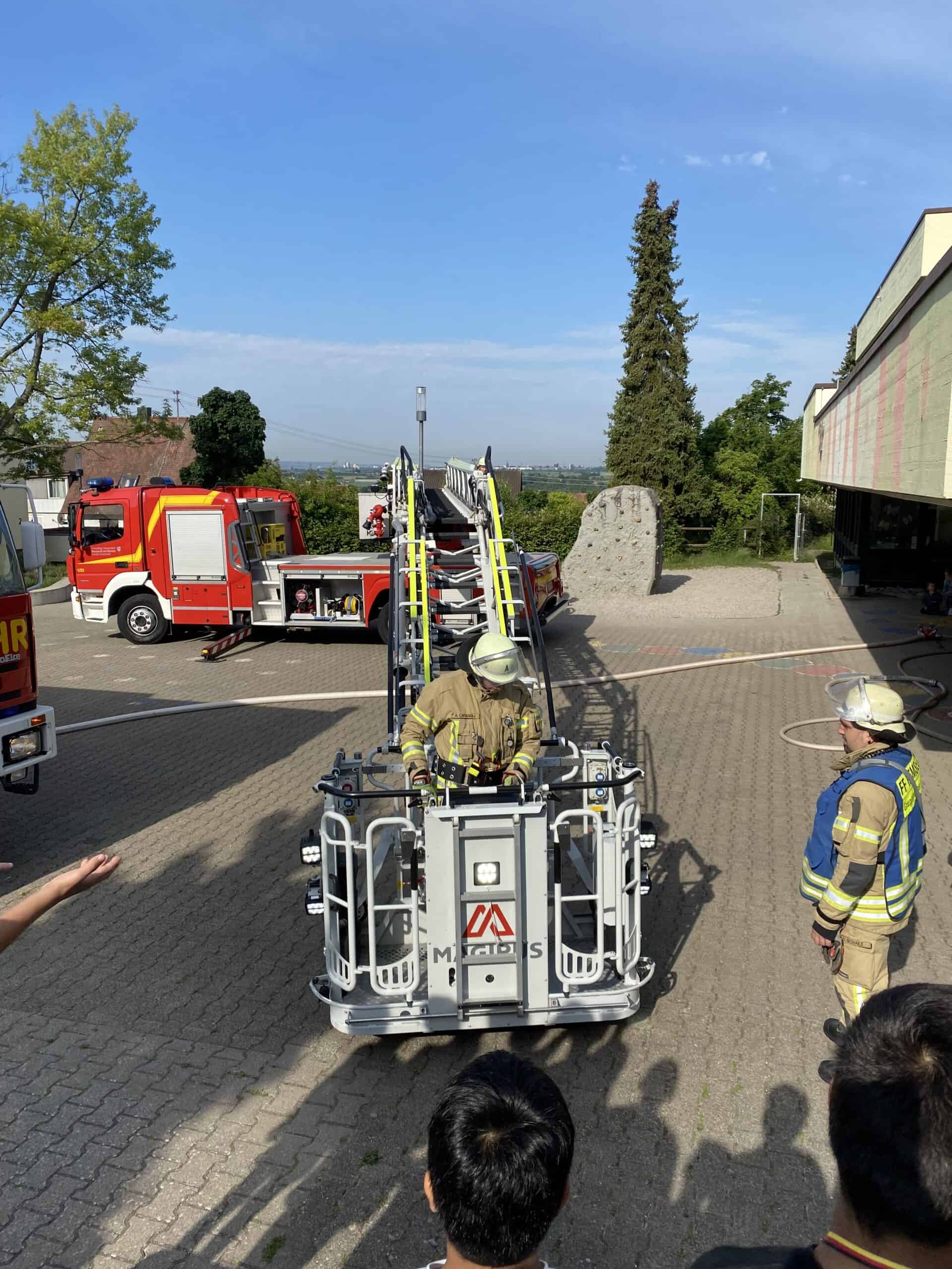 Natürlich war alles nur eine Übung. Für alle Beteiligten. Die Jugendfeuerwehr hatte ihren Aktionstag bei uns an der Schule. Ein Einsatztrupp rettete sogar Viertklässler mit der Drehleiter aus ihrem Klassenzimmer. Natürlich kam auch der Wasserschlauch zum Einsatz. Mit einem tosenden Beifall bedankten sich die Schülerinnen und Schüler bei den Einsatzkräften.